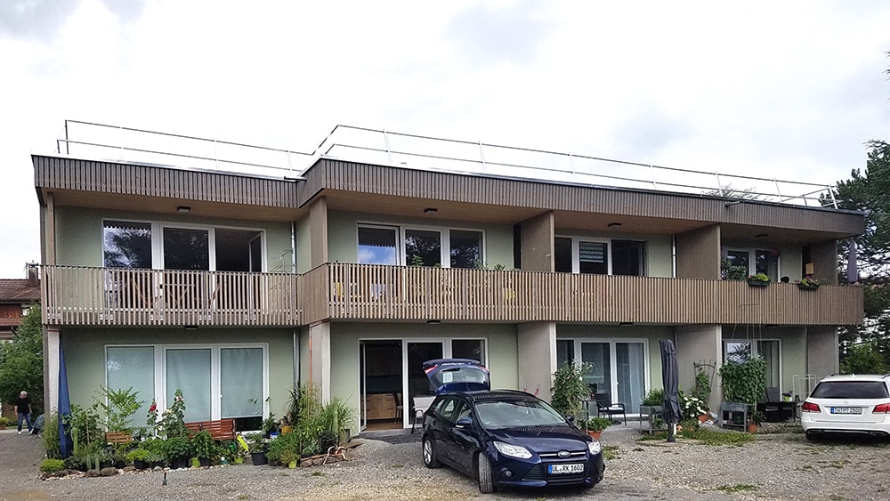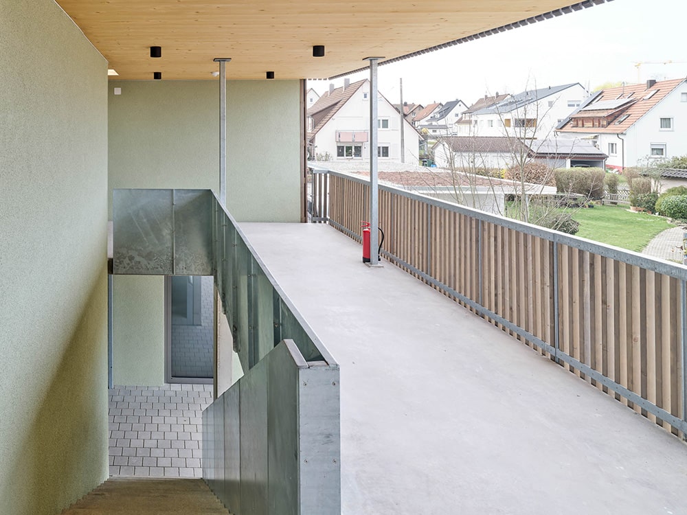 Das von buerohauser (Berlin/ Altensteig) geplante Gebäude mit insgesamt 480 m² Grundfläche und 240 m² Keller bietet sieben vollständig barrierefreie Mietwohnungen zwischen 41 und 73 m² und große Gemeinschaftsbereiche. Die mit 18 m² kleinste Wohnung war für eine Pflegekraft oder für eine Vermietung nach dem Modell „Wohnen gegen Hilfe“ gedacht. Auch sie wird aktuell regulär bewohnt, wobei der Mieter auch den Gemeinschaftsraum nutzt. Vier der Wohnungen sind sozial gebunden. Erschlossen sind die Einheiten über einen vorgelagerten, vor Witterung und Sonne geschützten Laubengang. Im Erdgeschoss haben die Wohnungen zum Garten 3 m tiefe Terrassen, im Geschoss darüber 1,6 m tiefe, überdachte Balkone mit gut 7 m² Fläche. Alle Einheiten verfügen über Lagerräume im Keller mit einer Fläche von ca. 5 m². „Die Leute, die sich verkleinern, goutieren es, Kellerräume zu haben“, weiß Laufer-Stark. Die nicht sozialgebundenen Mieten liegen mit Werten zwischen 14 und 16 €/m² 10 % unter dem Mietspiegel. Die vier sozial gebundenen Wohnungen sind noch einmal 33 % günstiger.