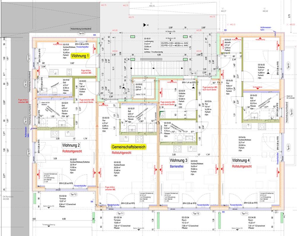 Für die Zielgruppe Rentner wurde das Gebäude umfassend auf Barrierefreiheit ausgelegt. Der ebenerdige Eingang und Aufzug ermöglichen einen stufenlosen Zugang. Drei Einheiten und der Gemeinschaftsbereich im Erdgeschoss sind gemäß DIN 18040-2R mit rollstuhlgerechten Bewegungsflächen sowie unterfahrbaren Waschbecken ausgestattet. Vier weitere Wohnungen sind allgemein barrierefrei nach DIN 18040-2, weil die Toiletten dort nur von einer Seite mit dem Rollstuhl angefahren werden können. Alle Bäder verfügen über schwellenlose Duschen und sind mit Stützklappgriffen für eine barrierefreie bzw. rollstuhlgerechte Nutzung ausgestattet. Selbst die Kellerräume sind teilweise rollstuhlgerecht.