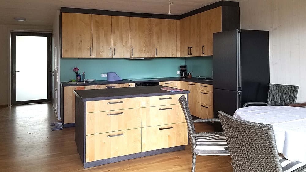 Untergeschoss, Balkone und Laubengang wurden in massiver Bauweise aus Stahlbeton oder Mauerwerk realisiert. Der Hauptbaukörper wurde in modularer Holzbauweise errichtet. Für das Tragwerk kamen vorgefertigte Wand- und Deckenelemente aus Brettsperrholz aus nachhaltiger regionaler Forstwirtschaft im Schwarzwald zum Einsatz. Selbst der Aufzugsschacht besteht aus den vorgefertigten Vollholzelementen. In den mit Vollholzküchen ausgestatteten Wohnungen sind die Holzoberflächen weiß lasiert und sichtbar. Insgesamt wirken die Aufenthaltsbereiche durch die Verblendung des Geländers mit glänzendem Blech kühler.