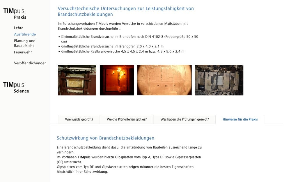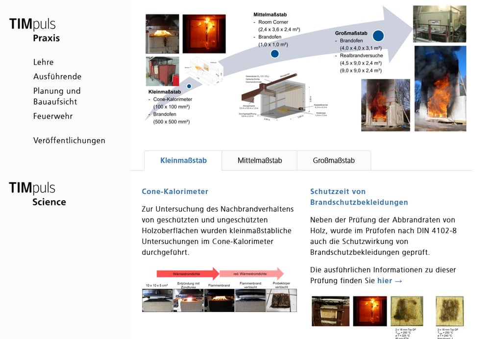 Die Seite TIMpuls Praxis gibt auf ihrer Startseite einen Überblick über das allgemeine Forschungsziel des Projekts und die dort durchgeführten Untersuchungen. Bild 1 zeigt einen beispielhaften Ausschnitt der Projektwebseite, auf der sämtliche klein-, mittel- und großmaßstäblichen Brandversuche kurz und prägnant erläutert werden. Ebenfalls ist hier auch der Zugriff auf den ausführlichen TIMpuls Schlussbericht [3] zu finden.