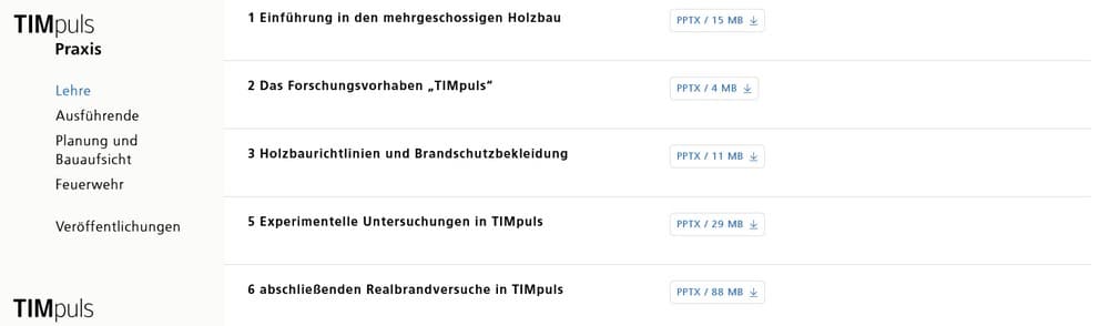 Die aufbereiteten Lehrmaterialien enthalten derzeit neun Foliensätze sowie eine Übung inkl. Musterlösungen. Sie können direkt als Grundlage für Vorlesungen herangezogen werden. Weitere Materialien befinden sich noch in der finalen Bearbeitung und werden in nächster Zeit auf der Website veröffentlicht. Die veröffentlichten Unterlagen enthalten u. a. Foliensätze zu den Themen: Projektbeschreibung TIMpuls, TIMpuls Brandversuche, Einfluss geschützter und ungeschützter Holzoberflächen im Brandfall, Hintergründe zu Anschlussdetails, Nachbrandverhalten von Holzkonstruktionen (die Abkühlphase, das Ablöschen sowie das Verhalten nach dem Ablöschen) sowie Einsatzmittel für die Brandbekämpfung und Branddetektion.