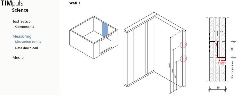 Ein zentrales Anliegen bei der Veröffentlichung der Daten war deren intuitive und benutzerfreundliche Aufbereitung für den späteren Anwender. Hierfür wurden die bestehenden Versuchsergebnisse zur besseren Übersicht durch weitere Detail- und Verortungszeichnungen ergänzt. Sämtliche relevanten Bauteile, Anschlüsse und Messstellen – etwa in Wand-, Decken- oder Fassadenbereichen sowie im Brandraum – sind mit umfassenden Darstellungen versehen. Die daraus entwickelte Menünavigation der Webseite unterstützt insbesondere Erstnutzende bei der schnellen und strukturierten Erschließung der Versuchsdaten. Bild 4 zeigt eine Übersicht zur Menüstruktur der Seite TIMpuls Science und die beispielhafte Beschreibung der Temperaturmessstellen in der Elementfuge von Wand 1 im Versuch 2.