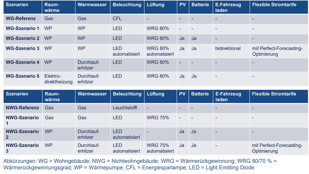 Bei den Szenarien 1 bis 3 werden schrittweise technische Fähigkeiten ergänzt. Der Einsatz einer Wärmepumpe, LED-Beleuchtung und Lüftung mit Wärmerückgewinnung eint diese Szenarien. In den Szenarien 2 und 3 kommen die lokale Energieerzeugung sowie -speicherung hinzu. Szenario 3 bildet ein vollausgestattetes Gebäude ab, das Sektorenkopplung durch Ladeinfrastruktur sowie eine Reaktion auf externe Preissignale ermöglicht. In den Szenarien 4 und 5 wurden alternative Technologien für die Erzeugung von Raumwärme (Elektrodirektheizung) und Warmwasser (Elektro-Durchlauferhitzer) eingesetzt. Bei den Nichtwohngebäuden wurde die Elektromobilität nicht mit einbezogen. Zudem legt Szenario 1 den Fokus auf die Potenziale von effizienter Beleuchtung und Lüftung mit Wärmerückgewinnung.