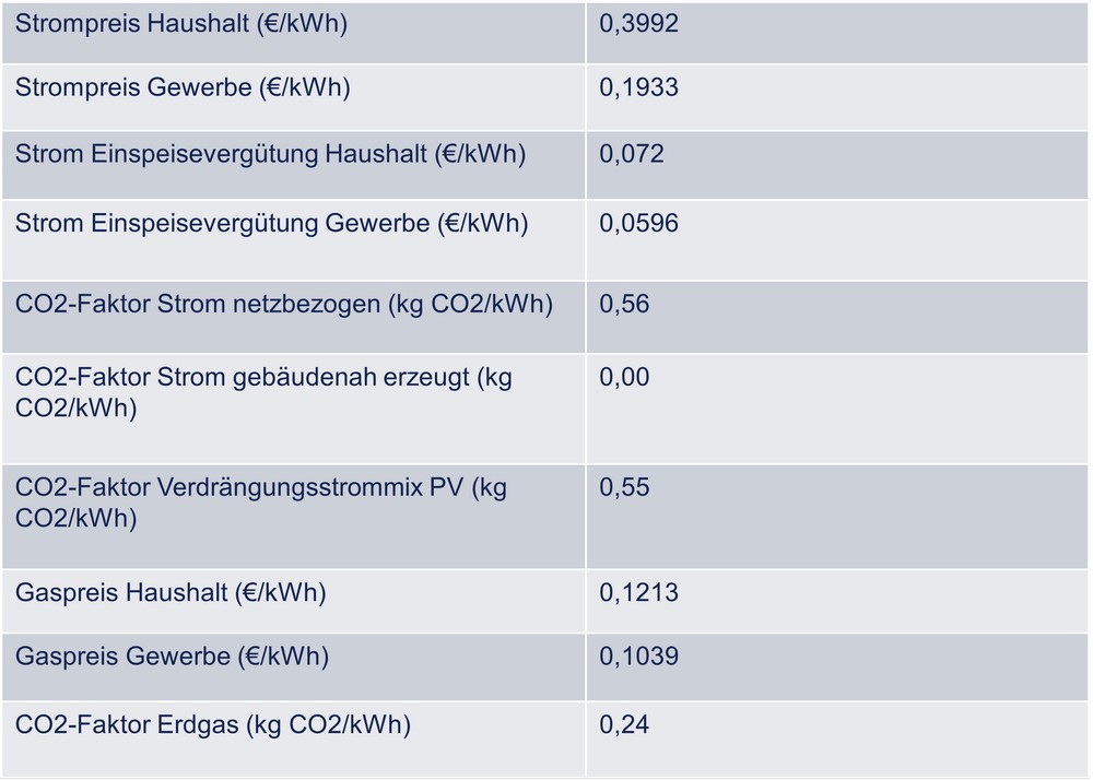 Bild 3 zeigt die Einsparpotenziale der Technologieszenarien im Mehrfamilienhaus. Für die Umrechnung der Energieverbräuche liegen die Annahmen in Bild 4 zugrunde. Bei der Ermittlung der Einsparpotenziale in den Szenarien mit lokaler Energieerzeugung ist der vor Ort erzeugte und genutzte Strom berücksichtigt. Strom, der eingespeist wird, wird mit der entsprechenden Einspeisevergütung bezahlt. Die Werte in Bild 3 sind über die drei Energieeffizienzklassen (A, C, F) gemittelt. Klar wird, dass besonders die Szenarien mit lokaler Energieerzeugung hohe Potenziale in allen drei Kategorien bieten. Blickt man tiefer in die Zahlen, zeigt sich, dass die Reaktion auf externe Preissignale dazu beiträgt, den Eigenverbrauch des lokal erzeugten Stroms zu steigern. In Szenario 3 bringt die Einbindung der Ladeinfrastruktur zusätzliche 12.000 kWh für die Ladung von Elektrofahrzeugen. Ein durchschnittliches E‑Fahrzeug fährt damit bis zu 70.000 km. Im Vergleich zwischen Einfamilien- und Mehrfamilienhaus zeigen die relativen Zahlen, dass hier eine hohe Ähnlichkeit der Potenziale besteht.