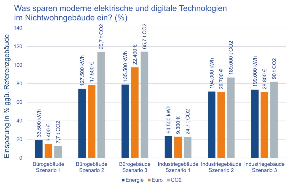 Das Fraunhofer-Institut für System- und Innovationsforschung (ISI) und ZVEI (Verband der Elektro- und Digitalindustrie) haben Berechnungen durchgeführt, die den Betrieb von Gebäuden mit verschiedenen Technologieszenarien simulieren. Ziel ist, die Einsparungen im Zusammenwirken der Technologien zu betrachten und so Potenziale zur Verringerung des Energieverbrauchs zu eruieren.