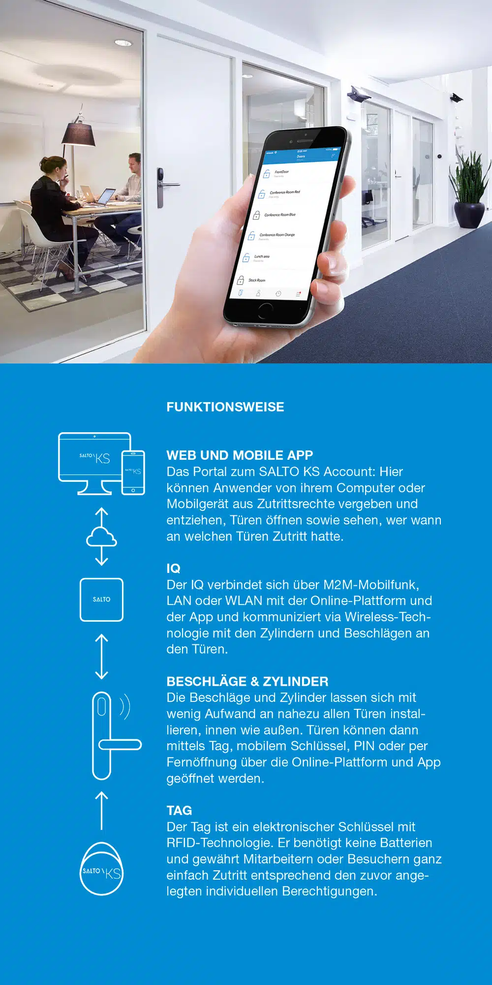 Ein Cloud-basiertes Zutrittssystem lässt sich kabellos und mit wenig Aufwand installieren. Zu den Kernfunktionen gehört das ortsunabhängige Zutrittsmanagement. Anwender legen über eine Web- und Mobile-App Nutzer an, gewähren oder entziehen Zutrittsrechte in Echtzeit und können Türen aus der Ferne öffnen. Dank der Protokollierung und Benachrichtigungen erhalten Verantwortliche optional einen Überblick über die Berechtigungen und Zutrittsereignisse sämtlicher Objekte. Für den Betrieb ist keine Softwareinstallation und nur ein geringer Installations- und Konfigurationsaufwand erforderlich, da die Systemkomponenten und die Türhardware kabellos per Funk miteinander Daten austauschen. Die gesamte Kommunikation zwischen den Komponenten erfolgt hochverschlüsselt und ist damit gegen Abhören und Kopieren geschützt. Sicherheitskritische Vorgänge lassen sich nur über eine Zwei-Faktor-Authentifizierung initiieren.