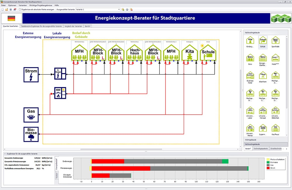 Die Stärken des District Energy Concept Adviser (Energiekonzept-Berater für Stadtquartiere) liegen in der schnellen Abbildung eines Quartiers per Drag-&-Drop über Typgebäude (s. Abb. rechts oben) und in der Vielzahl der Vorkonfigurationen, etwa der baualtersabhängigen Hüllflächenqualitäten, der Anlagensystembestandteile und der Verwendung von Standardnutzerprofilen. Der Nutzer kann mit wenigen Anpassungen ein Quartier zügig abbilden. Durch die Kombination mit unterschiedlichen zentralen oder dezentralen Versorgungsvarianten und Gebäudequalitäten lassen sich schnell verschiedene Energiekonzepte erstellen und miteinander vergleichen. Die energetische Qualität des Quartiers kann über den Endenergiebedarf,den Primärenergiebedarf und die CO²-äquivalenten Emissionen bewertet werden. Derzeit haben bereits mehr als 1.500 Nutzer die deutsche Version des Softwaretools heruntergeladen.