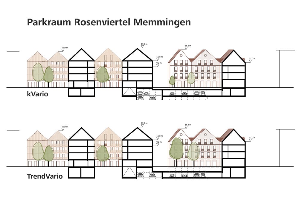 Durch die platzsparende Bauweise der Parksysteme wird für die Tiefgarage auch weniger Raum- und Deckenhöhe benötigt und es muss insgesamt weniger Bodenfläche versiegelt werden. Davon profitiert auch das Mikroklima der Memminger Innenstadt, denn so entstehen im Rosenviertel nun zwei große durchgrünte Innenhöfe. Da folglich je Innenhof rund 150 m² Fläche nicht unterbaut werden, haben sogar Großbäume ausreichend Platz zum Wachsen.