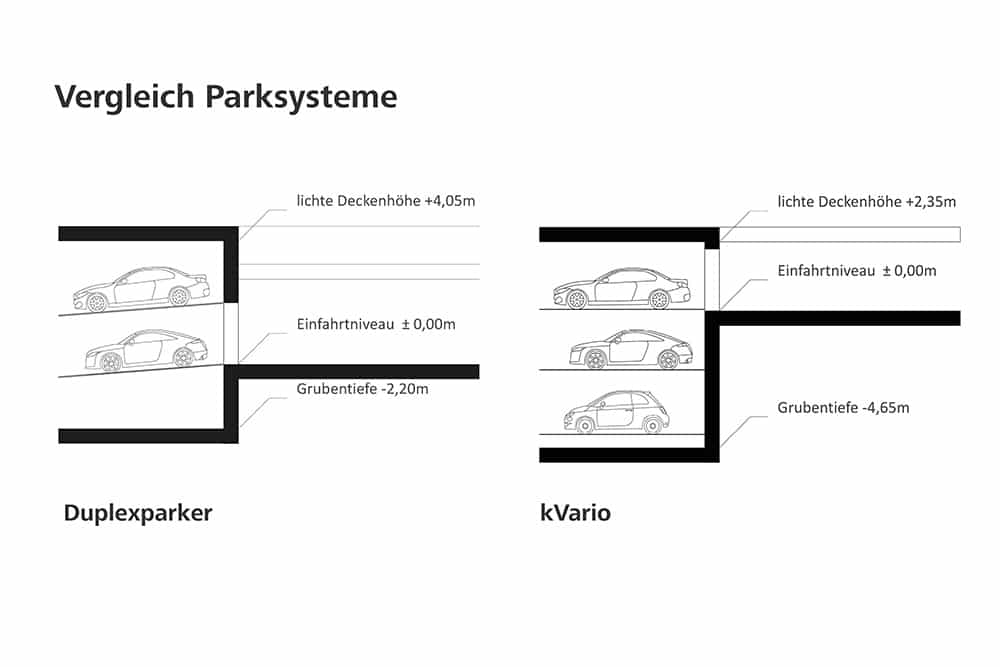 Für den benötigten Parkraum des Rosenviertels hatte das f64-Team um Architekt Thomas Meusburger ursprünglich eine Tiefgarage unterhalb der Rosenhöfe mit klassischen Duplexparkern eingeplant, also eine Variante, bei der zwei Fahrzeuge jeweils übereinander geparkt werden. Durch diese Doppelparker war es möglich, auf eine zweite Tiefgaragenebene zu verzichten. In der Detailplanung und in der engen Abstimmung mit dem Parkraumspezialisten Klaus Multiparking kristallisierte sich eine Alternative heraus, die noch weitere Vorteile bringt.