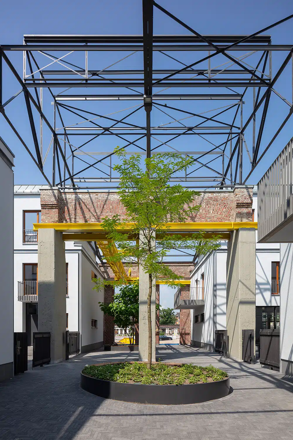 Die Freiflächen im Inneren der Halle 17 wurden nach einem Konzept der Landschaftsarchitekten Lill + Sparla aus Köln gestaltet. Als Ort der Begegnung und des Zusammenlebens bilden sie die grüne Mitte des Clouth-Quartiers.
