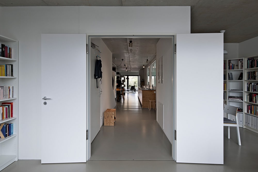 Die Schichtung der verschiedenen Nutzungen ist am zweigeschossig verglasten Sockel von außen klar ablesbar. Hier liegen neben einem Fahrradgeschäft und einem Restaurant auch die Ateliers für Künstler und andere Kulturschaffende, während sich darüber insgesamt 66 teils zweigeschossige, zwischen 24 und 132 m² große Wohnungen befinden. Letztere lassen sich leicht koppeln bzw. teilen und damit mühelos an veränderte Nutzerbedürfnisse anpassen. Zugänglich gemacht werden sie von mittig im 2. und 5. Obergeschoss angeordneten Erschließungswegen. Diese sind über fünf begrünte Lichthöfe miteinander verbunden, die die Belichtung der bis zu 23 m tiefen Wohnungen übernehmen und zugleich feinsinnig gestaltete Räume für gemeinsame Aktivitäten bieten.