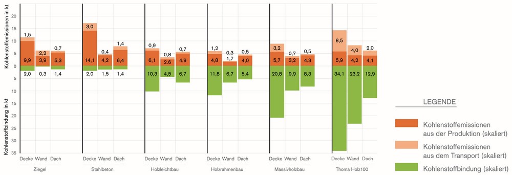 Die Berechnungen zeigen, dass die beiden Massivholzkonstruktionen in Bezug auf den Kohlenstoffhaushalt eindeutig eine bevorzugte Konstruktionsart sein sollten, wenn das Holz in der Region vorhanden ist – vgl. Abbildungen oben.