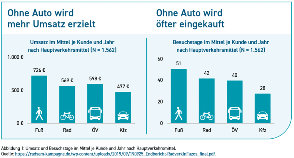 Zwar geben Autofahrende pro Einkauf im Durchschnitt mehr Geld aus als Kunden, die zu Fuß oder mit dem Rad unterwegs sind. Gleichzeitig kommen sie jedoch seltener ins Geschäft. Über das Jahr betrachtet, wird so durch Personen, die mit dem Fahrrad, ÖPNV oder zu Fuß das Geschäft aufsuchen, ein höherer Umsatz generiert (u. a. [20] [11] [21]). Besonders relevant sind hierbei kleinere Gelegenheitseinkäufe, die durch häufigere Besuche und das Schlendern entlang von Schaufenstern gefördert werden.