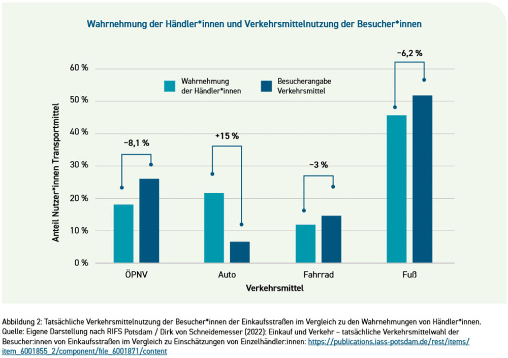 Einen Erklärungsversuch, warum Händler sich dennoch oftmals vehement gegen Verkehrsberuhigung aussprechen, liefern weitere Studien. Demnach überschätzen Gewerbetreibende systematisch den Anteil ihrer Kunden, die mit dem Auto kommen (u. a. [9] [22]). Und auch die zurückgelegte Wegelänge zum Geschäft wird von Gewerbetreibenden mehrheitlich überschätzt. So glauben die befragten Händler zweier Berliner Geschäftsstraßen, dass 12 % ihrer Kundschaft aus einem Umkreis unter 1 km käme – tatsächlich sind es mehr als die Hälfte [20]. In der Summe sorgen diese verzerrten Wahrnehmungen dafür, dass die Relevanz der Erreichbarkeit des eigenen Geschäfts mit dem privaten Pkw deutlich überschätzt wird.