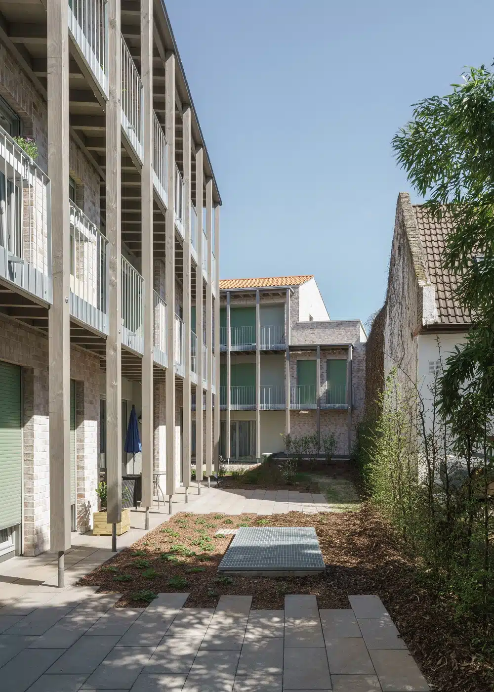 Ergänzt werden diese, vor allem in südlicher und östlicher Richtung, von zahlreichen Arbeiterhäuschen aus der Jahrhundertwende. Ursprünglich für Beschäftigte des nahegelegenen Opel-Werks gebaut, funktioniert ihr Aufbau ganz ähnlich, wobei sie in einem etwas kleineren Maßstab errichtet wurden, um der veränderten Nutzung – vom landwirtschaftlichen Betrieb zum Wohnhaus mit Möglichkeiten zur Selbstversorgung – Rechnung zu tragen. In diese kleinteilige, dicht bebaute Struktur hinein gesellt sich nun ein Ensemble mehrgeschossiger Wohngebäude. Entworfen von Baur & Latsch Architekten, greifen sie die vorhandenen Typologien auf und bereichern das Viertel zugleich um ein vollkommen neues Konzept, das vor allem dringend benötigte kleine Wohnungen zur Verfügung stellt.