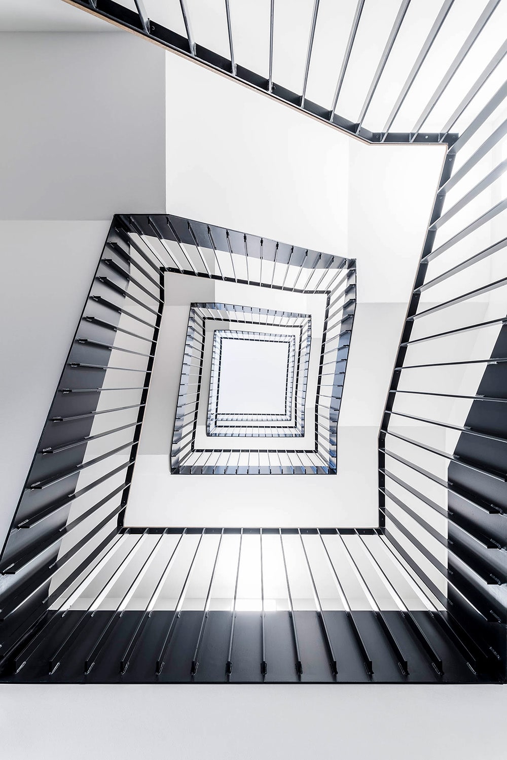 Vom Hof sind die vier Kerne des rückwärtigen Gebäudeteils erschlossen. Dieses Gebäude hat, wie auch die gesamten Hoffassaden der beiden anderen Gebäudeteile, eine weiße Putzfassade. Die helle Oberfläche gibt dem Hof Weite und Licht, und spielt mit klassisch modernen Themen im Detail. Während in den Bauten an der Straße die Wohnungen entweder durchgesteckt oder ausschließlich auf den Hof orientiert sind und sich nur auf jeweils einer Ebene befinden, gibt es im rückwärtigen Bau einige Maisonette-Wohnungen. Sie vermitteln ein Haus-Gefühl und sind ein weiterer Baustein in einem breit gefächerten Wohnungsmix.