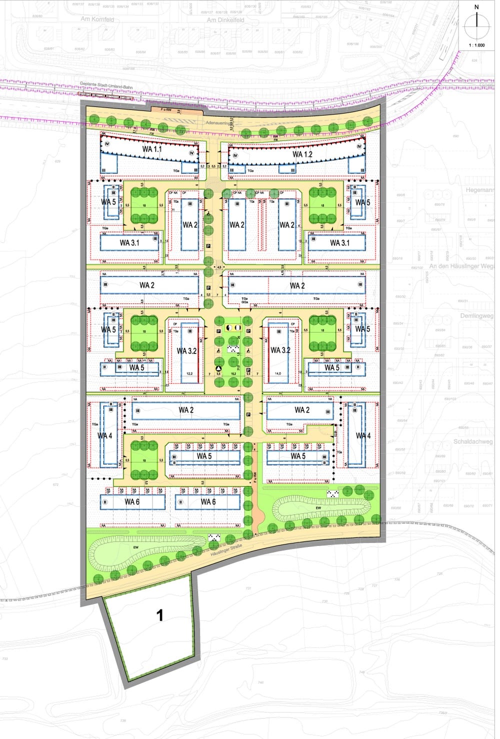 Das Baugebiet ist in sechs Wohnhöfe um eine Quartiersmitte gegliedert. Die innere Erschließung erfolgt als verkehrsberuhigte Mischfläche über eine von Nord nach Süd verlaufende Hauptachse mit Stichstraßen in die Wohnhöfe. In den Baufeldern nimmt die Baudichte einer Kreisstraße ER1 im Norden zum Landschaftsraum im Süden ab. Parallel zur Kreisstraße läuft auch die Trasse der Stadtbahn. Zum Baugebiet ist sie durch Wohnungsbauten mit vier Geschossen und Schallschutzfenstern abgeschirmt. In der Gebietsmitte und am südlichen Rand des Baugebiets werden die Wohnhöfe von dreigeschossigen Mehrfamilienhäusern sowie zwei- bis dreigeschossigen Reihenhauszeilen gebildet. Im Süden schließen Retentionsflächen das Gebiet ab, bevor eine Straße, Grünflächen und eine Bachlandschaft mit verschiedenen Weihern folgen. Einkaufsmöglichkeiten, Schulen, Kindergärten, Arztpraxen sowie gastronomische Angebote gibt es fußläufig. Mit dem Rad sind es 15 Minuten zum Bahnhof.