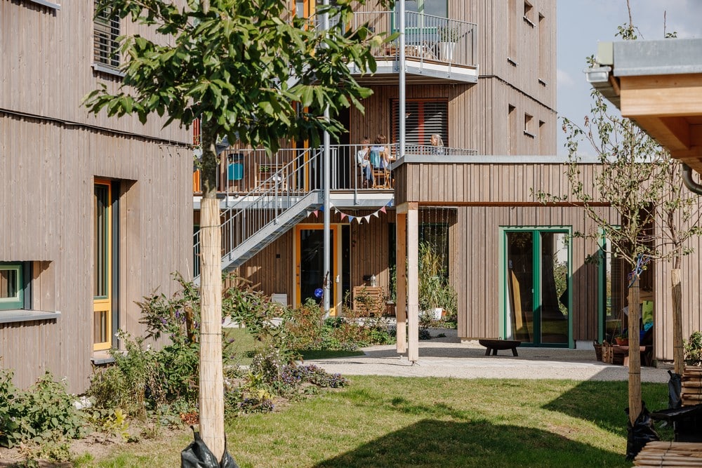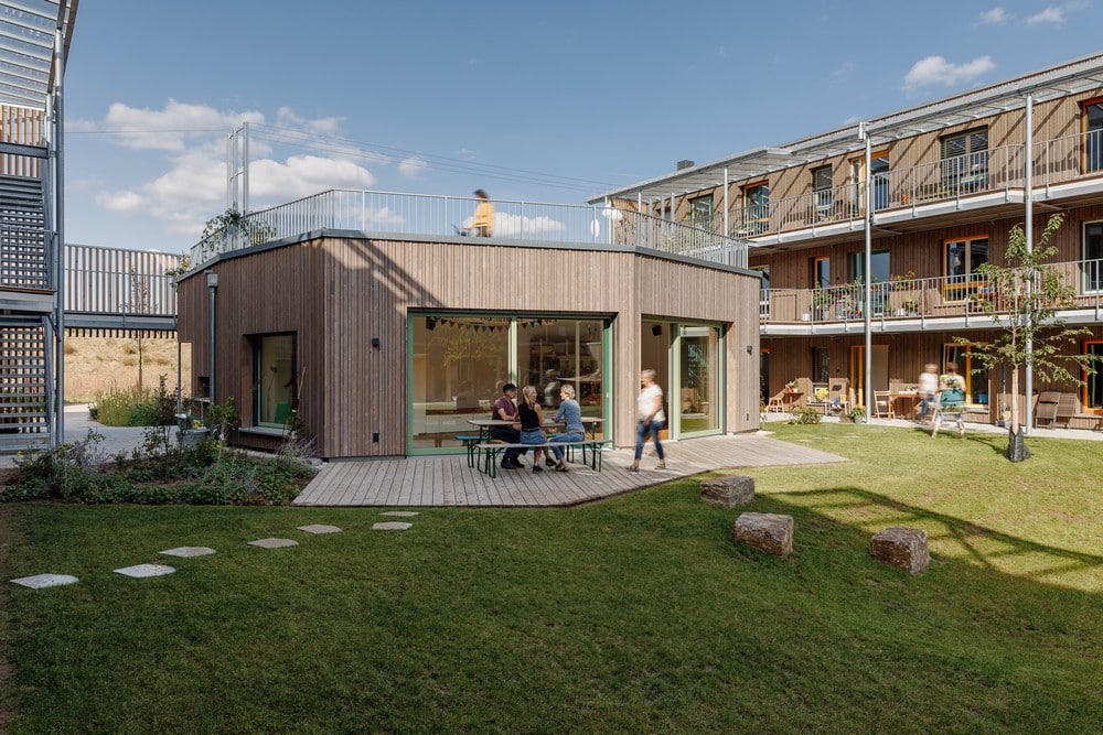 „Ziel der städtebaulichen Planung ist das harmonische Miteinander von öffentlichem Außenraum und geschütztem, halb privatem Innenhof“, sagt die Projektarchitektin Michaela Stömer. Ein halbtransparentes Spalier aus Lärchenholzlamellen grenzt den Innenhof zum öffentlichen Straßenraum ab und schützt auch den Dachgarten auf dem Gemeinschaftshaus. Zentrum der Architektur ist der gemeinschaftliche Innenhof. Im Norden begrenzt ihn das organisch geformte Gemeinschaftshaus, im Süden ein Werkstattgebäude mit überdachtem Außenbereich, das sog. „Werkelhaus“. Für das Gemeinschaftshaus wurde eigens der B-Plan geändert. Die Längsseiten des Hofes bilden zwei Wohnriegel in Holzbauweise mit 2.110 m² Wohnfläche. Die Erschließung über Laubengänge mit möblierbaren Ausweitungen lockert den etwas starr wirkenden B-Plan auf. Das Dach ist intensiv begrünt und mit PV versehen. Nur einer der Riegel erhielt einen Keller. Die Wohnungen haben zwei bis fünf Zimmer, zum öffentlichen Raum entweder einen Balkon oder eine ebenerdige Terrasse, sind West-Ost ausgerichtet und barrierefrei. Den Innenhof beleben die Laubengänge. Die Wohnungstüren sind verglast. „Das hat eine andere Wirkung“, betont Evelyn Peppler.