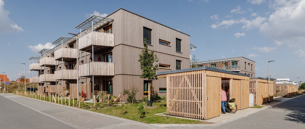 Mobilität wurde von Anfang an mitgedacht. So entfielen etwa Grundstücksoptionen auf dem Land. Prämisse war, dass ein Areal nicht weiter als 10 km bis zum nächsten Bahnhof liegen sollt. Es gibt ein gemeinschaftliches Lastenrad und ebenerdige Radabstellräume für deutlich mehr Fahrräder als gefordert. Für Pkws sind zehn Stellplätze vorhanden. Vier davon sind für gemeinschaftliche Autos reserviert – eigene oder vom Carsharing Verein, bei dem alle Mitglied sind. Das E-Auto des Vereins bekommt Strom vom Dach. Dank des Mobilitätskonzepts brauchten 65 % der Stellplätze nicht gebaut zu werden – ursprünglich war der Stellplatzschlüssel der Stadt 1,2. „Wir sind sehr glücklich, dass sie uns entgegenkamen und weit weg von ihrem Stellplatzschlüssel gegangen sind“, freut sich Peppler. „Mit dem Mobilitätskonzept haben wir die Stadt auch überzeugt, dass wir keine Tiefgarage brauchen.“