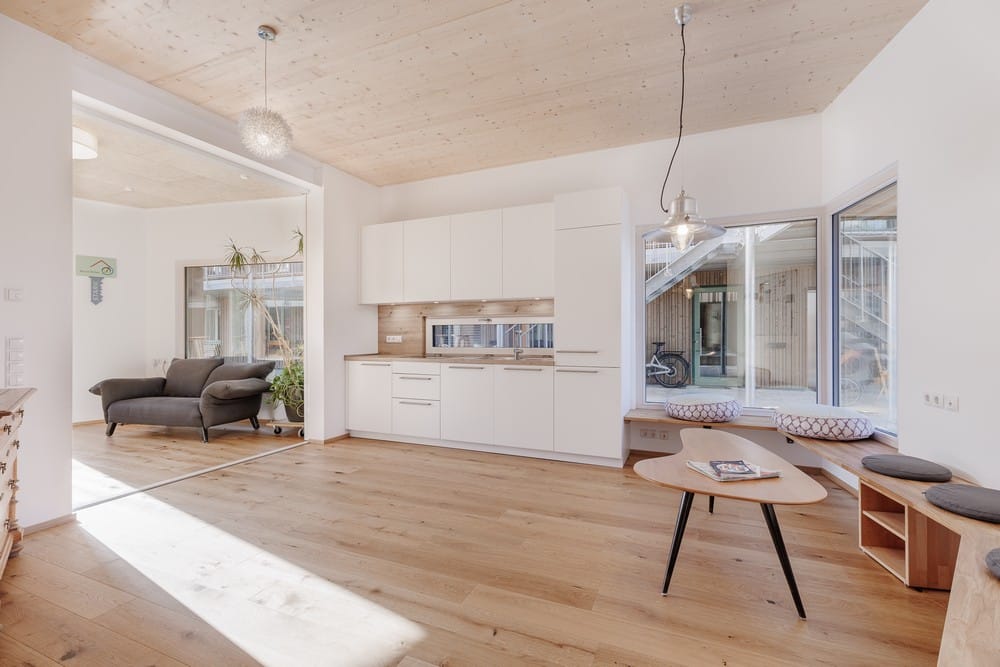 „Wir wollen unsere Wohnungen verkleinern und auf Gemeinschaftsräume ausweichen“, formuliert es Evelyn Peppler, die Coach, Moderatorin für Gemeinschaftsentscheidungen sowie zertifizierte Beraterin für Gemeinwohlökonomie ist. Gemeinschaftlich genutzt werden der Innenhof mit Kinderspielfläche, Feierabendwiese, Nutzgarten für Gemüse und Obstspalier, ein Gemeinschaftshaus mit 106 m² und eine Werkstatt mit 30 m². Im Waschraum braucht es nur fünf Waschmaschinen für alle. Und dann gibt es noch Technikräume, kleine Sitznischen auf den Laubengängen und im Keller eine gemeinschaftliche Fläche für Fahrräder mit ca. 100 m². „Gemeinschaft ist unser Herzstück“, betont Peppler. „Der Innenhof ist ein bisschen wie ein Herz mit Werkstatt unten und Gemeinschaftsraum oben.“ Das Gemeinschaftshaus wird für private Feste, als Homeoffice und wöchentlich für Yoga und Meditation genutzt. Im Winter spielen die Kinder dort.