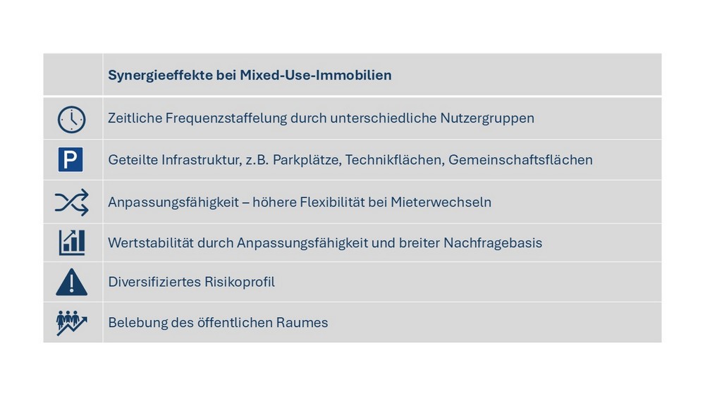 Aus Investorensicht bietet Mixed-Use ein diversifiziertes Risikoprofil: Schwächen in einem Marktsegment – beispielsweise bei Büros durch Homeoffice-Trends – können durch andere Nutzungen wie Wohnen kompensiert werden. Dies schafft langfristige Wertstabilität durch Anpassungsfähigkeit und eine breite Nachfragebasis.
