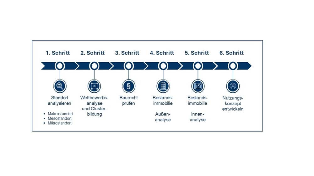 Für ein erfolgreiches Nutzungskonzept ist eine systematische Analyse notwendig. Die IPH Handelsimmobilien GmbH hat zusammen mit der BBE Handelsberatung GmbH dafür einen strukturierten 6-Schritte-Prozess entwickelt, der vom großräumigen Standort bis ins Detail der Bestandsimmobilie führt und schließlich in ein tragfähiges Nutzungskonzept mündet.