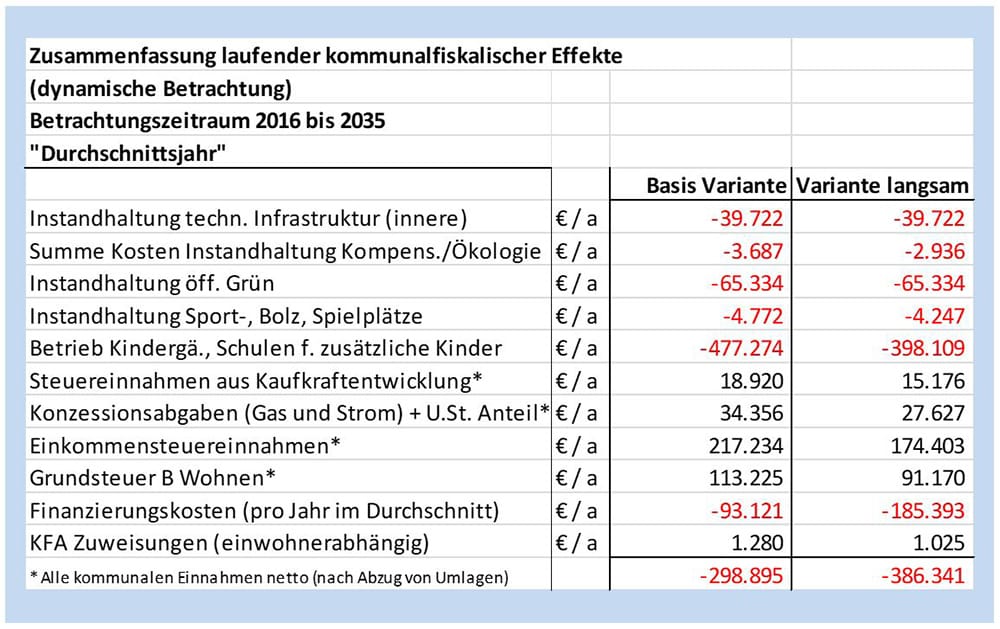 Die erläuterten Ergebnisse zeigen, dass eine langsame Entwicklung des Gebiets zwar geringfügige Vorteile in den Betriebskosten für Kitas und Schulen dadurch ergibt, dass die Zahl der neu zu betreuenden Kinder in der Spitze etwas geringer ist, weil eine gleichmäßigere Verteilung über die Zeit vorliegt. Alle anderen Faktoren (insbesondere die Finanzierungskosten und die Erlöse) wirken sich jedoch deutlich negativ aus, sodass der Kita-Schulen-Effekt schnell überkompensiert wird.