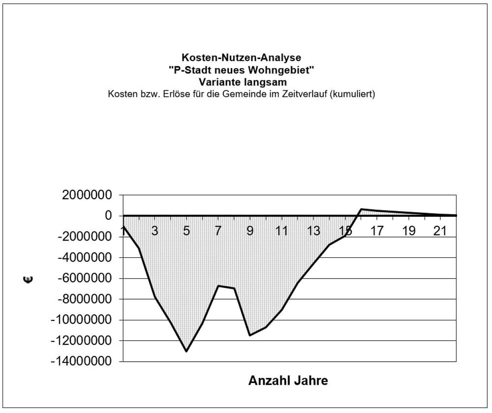 Die Grafik des Cashflow in der summarischen Darstellung zeigt deutlich den Effekt des Faktors Zeit in der Flächenentwicklung. Das in der statischen Betrachtung sehr deutlich positive Projektergebnis wird über den sehr langen Entwicklungszeitraum nahezu vollständig verbraucht. Eine zügige Entwicklung des Gebiets bietet in diesem Beispielprojekt also Vorteile. Die Entwicklungsrisiken im Sinne einer Vorfinanzierung von Erschließungen sind in der langsamen Variante am größten, weil der Zeitraum des Engagements mit 15 Jahren deutlich länger ist als in der Basis-Variante. Es steht also ein längerer Zeitraum zur Verfügung, in dem Störungen und Probleme in der Projektdurchführung auftreten könnten. Aus der Sicht des Risikomanagements wäre deshalb zu raten, das Vorhaben bei Vorliegen der Gremienentscheidungen in jedem Fall zügig durchzuführen.