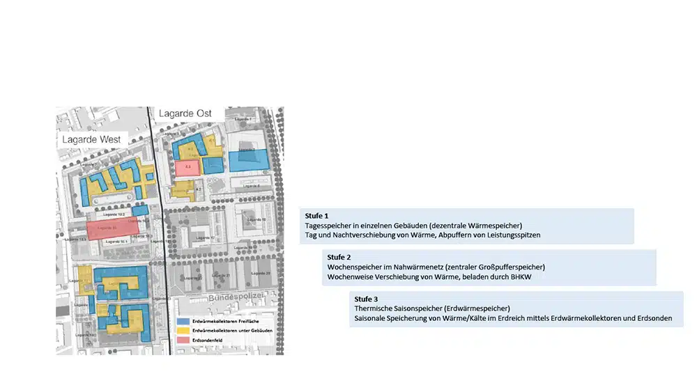 Das Wärmekonzept des Lagarde-Campus zeichnet sich durch seine intelligente und innovative Verknüpfung unterschiedlicher Wärme- und Energiequellen unter Einbindung von Wärmespeichern aus, darunter ein Großpufferspeicher. Es zeigt, dass in einem Quartier mit unterschiedlichen Heizsystemen und Temperaturanforderungen (Niedertemperatur-Systeme im Neubau, Hochtemperatur-Systeme im Bestand) dank smarter Technik und Planung die Versorgung mit einem hohen Anteil regenerativer, vor Ort erzeugter Wärme möglich ist und welche effektive Rolle thermische Speicher dabei spielen.