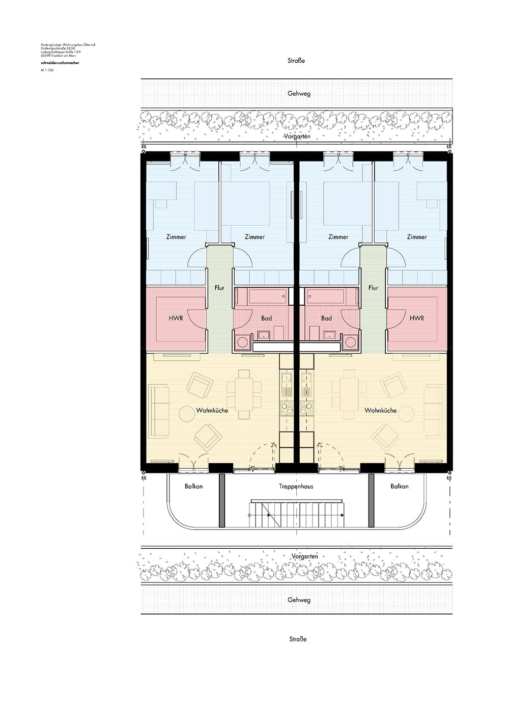 Im Frankfurter Stadtteil Oberrad hat schneider+schumacher im Auftrag der ABG FRANKFURT HOLDING im Jahr 2018 ein Wohnungsbauprojekt errichtet. Dafür wurde ein universell einsetzbarer Wohnungsbautypus entwickelt, der an die Bedingungen des Ortes adaptierbar ist und sich so räumlich und architektonisch in sein Umfeld einfügt.